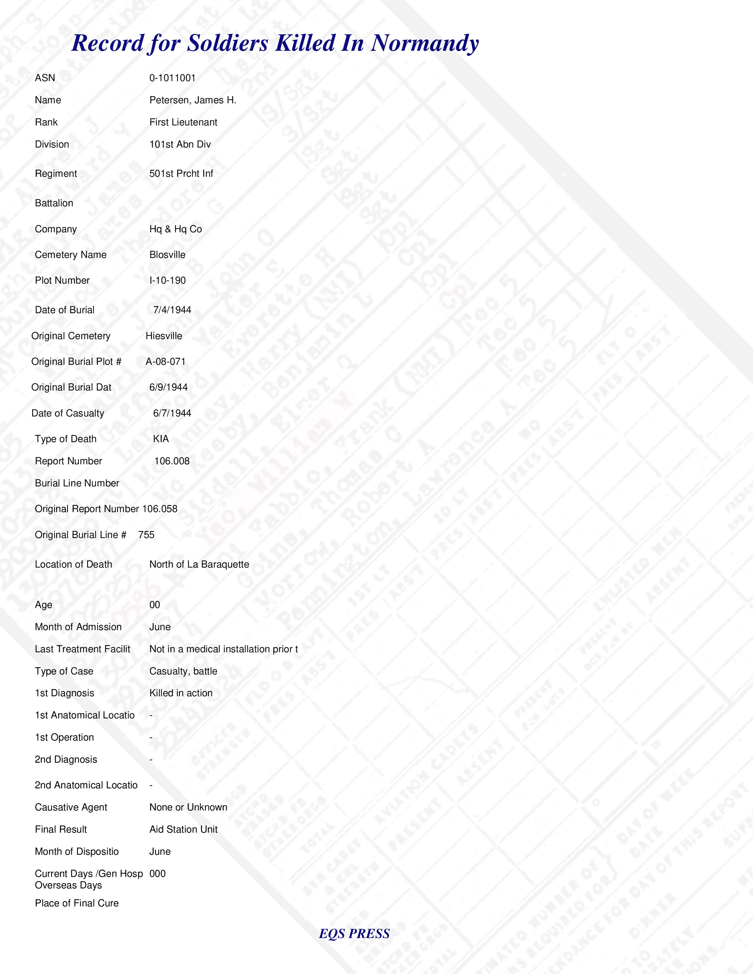 1st Lt James H. Petersen Hq & Hq Co 501st