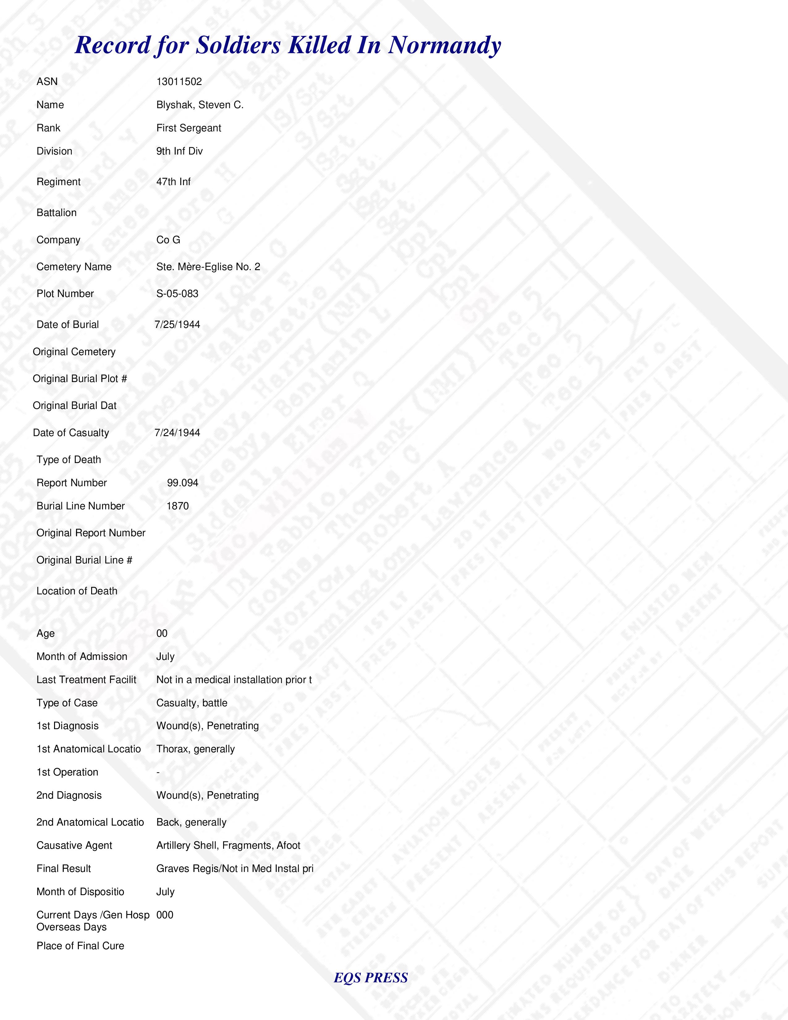 F/Sgt Steven C. Blyshak Co G 47th Inf 9th