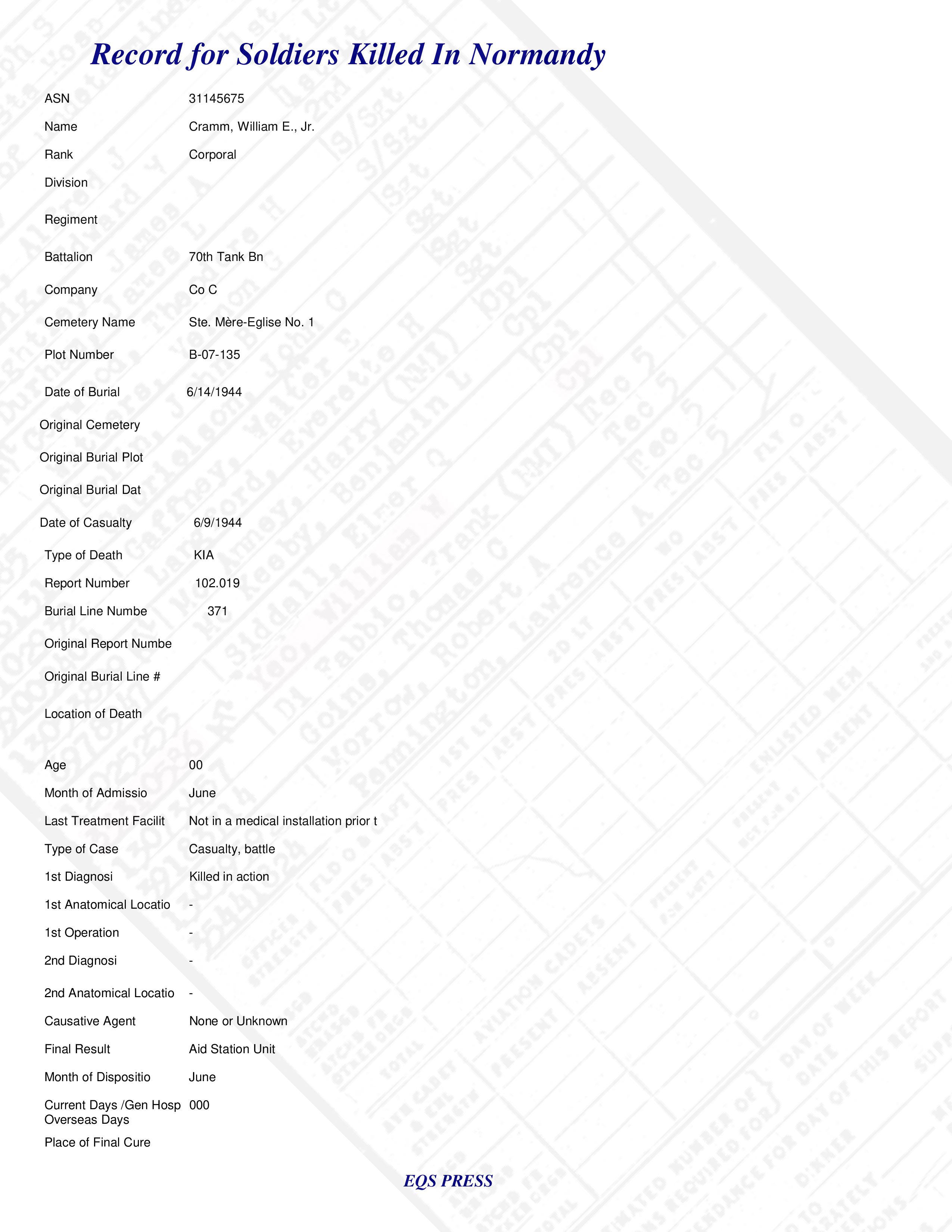 Cpl William E. Cramm Jr. Co C 70th Tk Bn Military Records