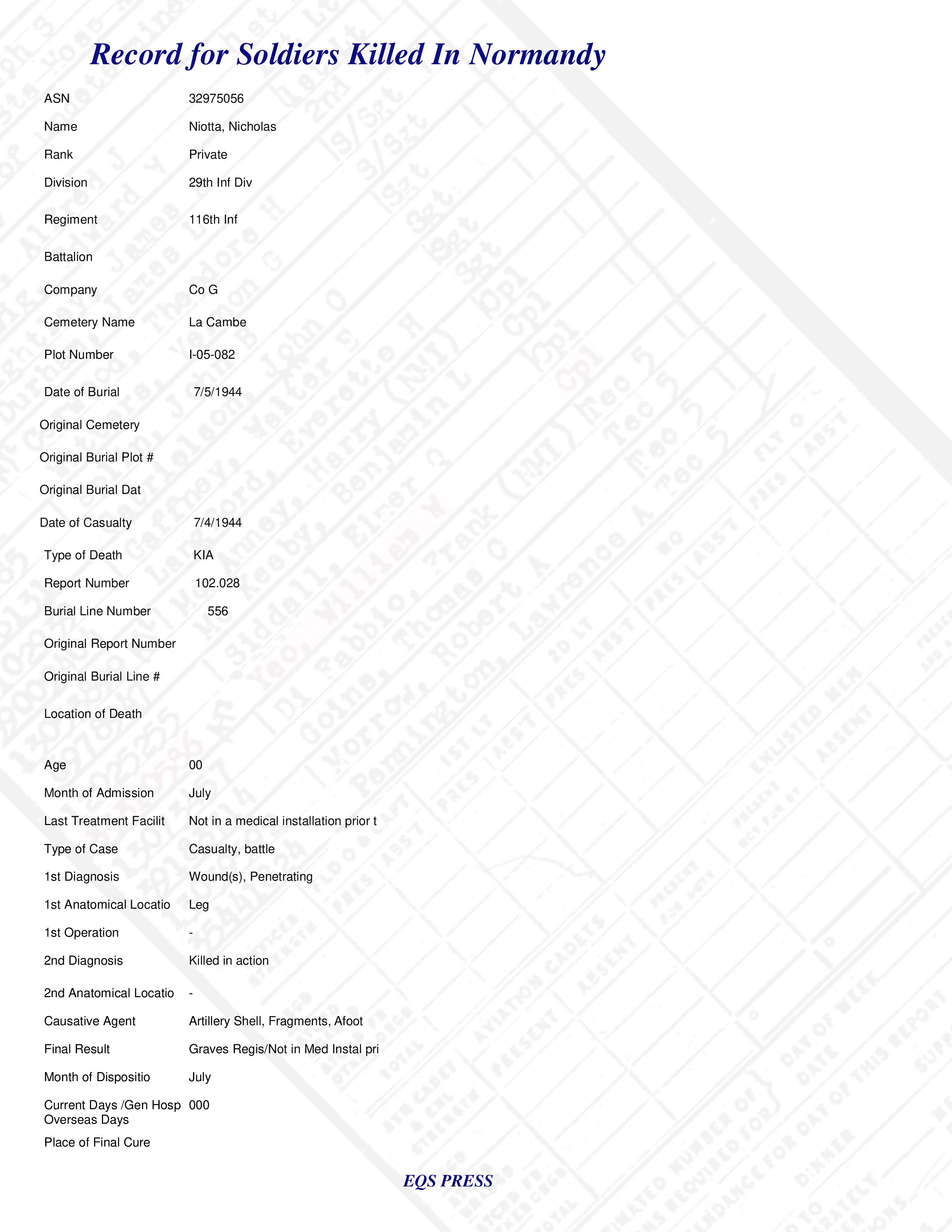 Pvt Nicholas Niotta Co G 116th Inf 29th Inf