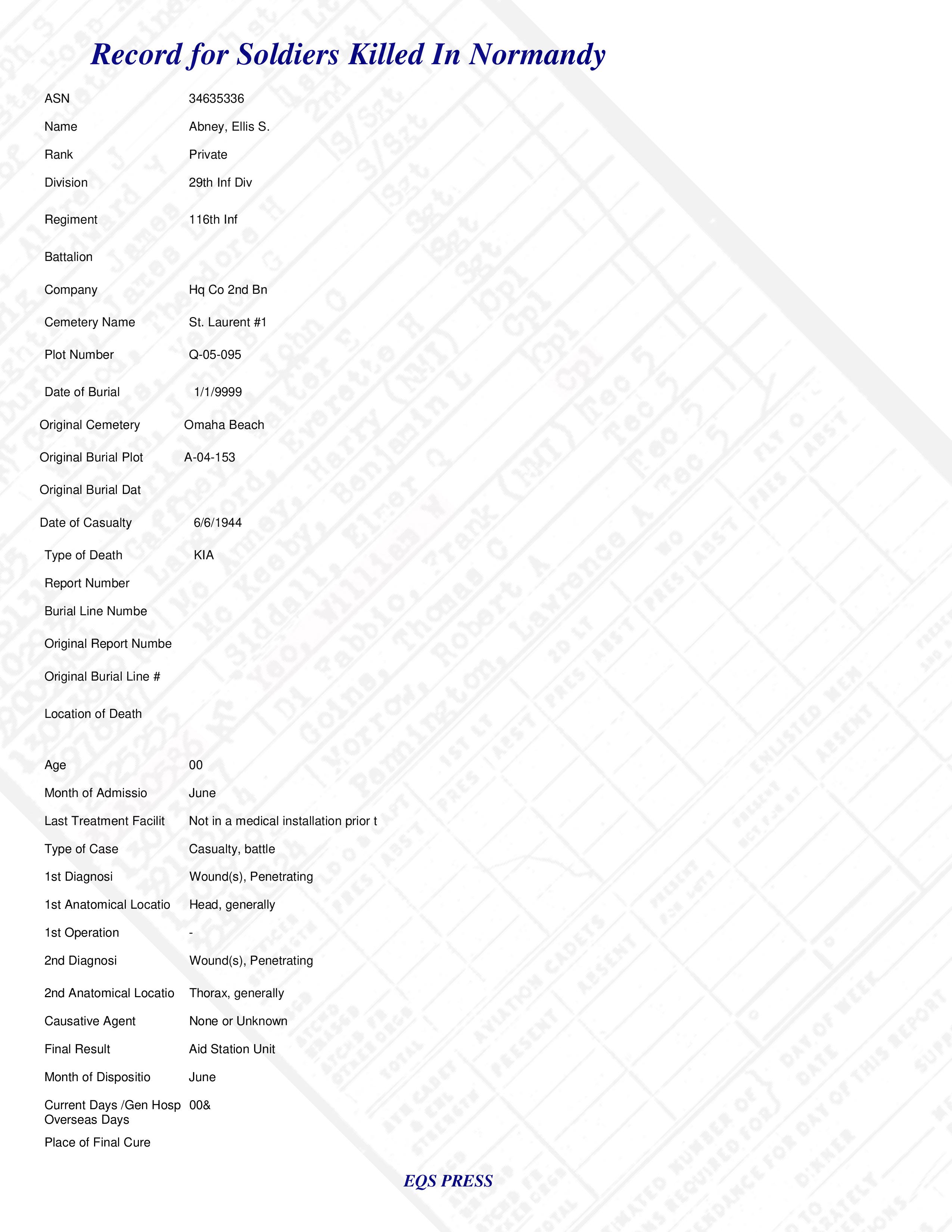 Pvt Ellis S. Abney Medic, Med Det Hq Co 2nd Bn 16th Inf 29th Inf Div Military Records IDPF