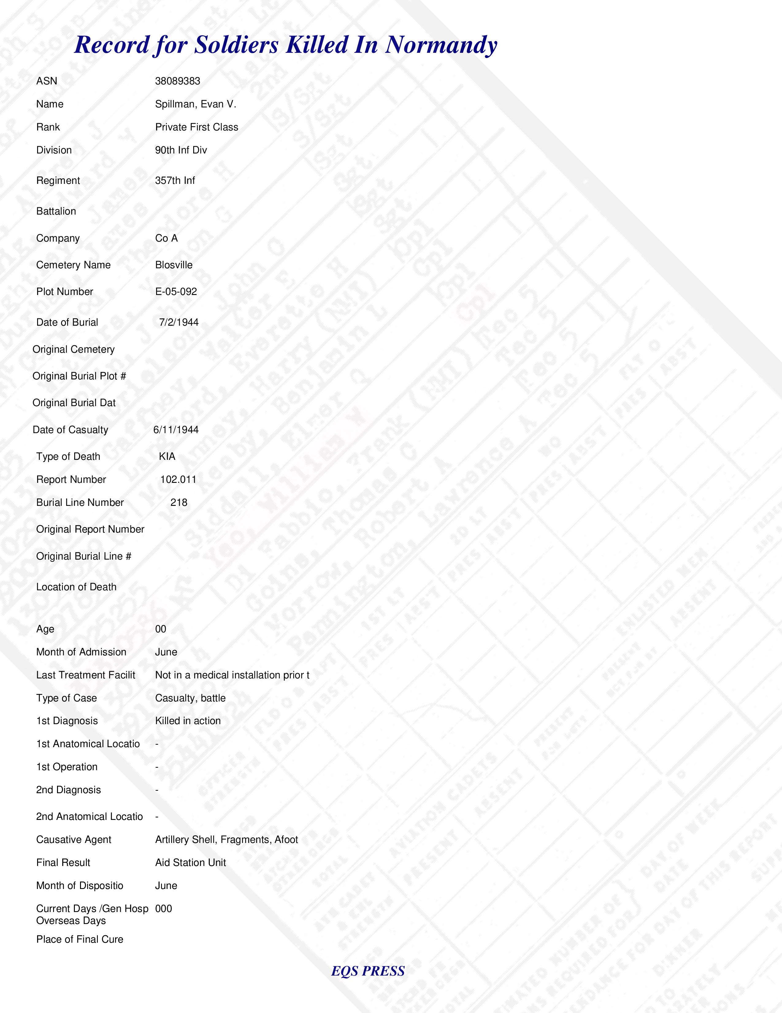 Pfc Evan V. Spillman Co A 357th Inf 90th Inf