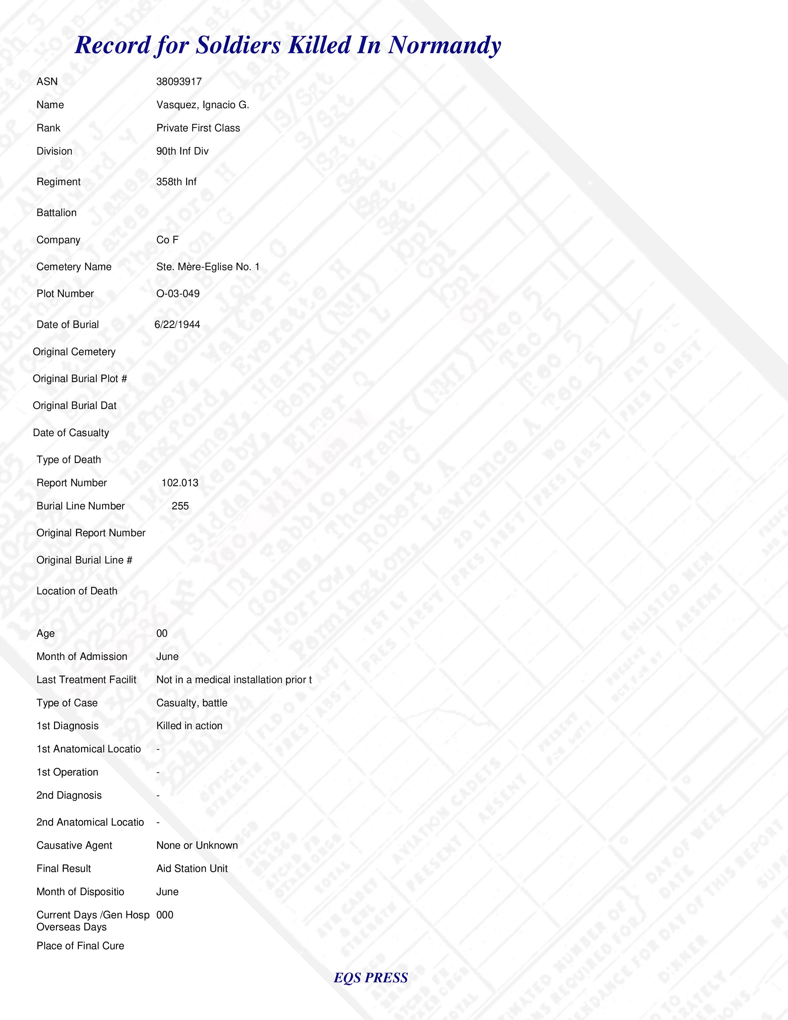 Pfc Ignacio G. Vasquez Co F 358th Inf 90th