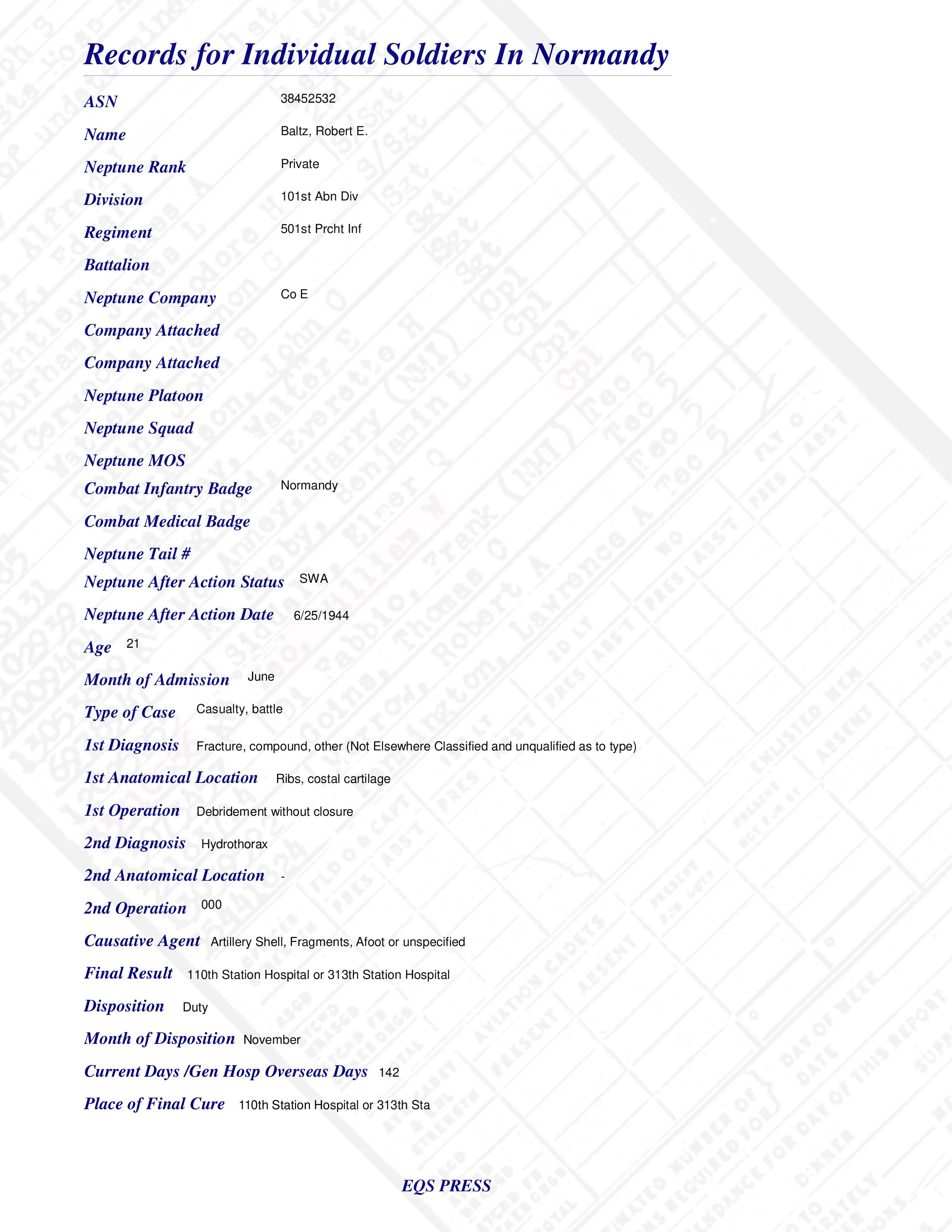 Pvt Robert E. Baltz Co E 501st Prcht Inf atchd to 101st Abn Div Military Records