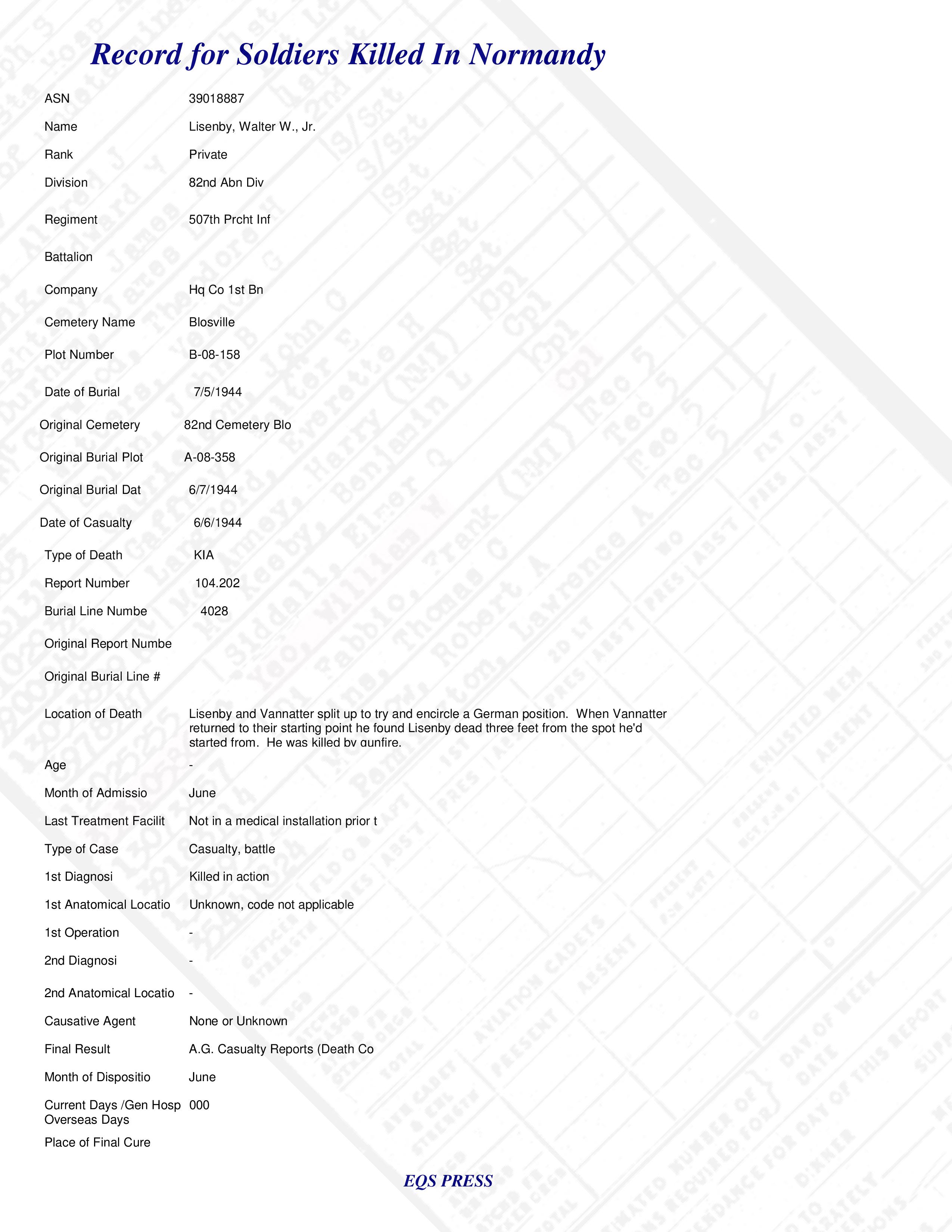 Pvt Walter W. Lisenby Jr. Security Hq Co 1st