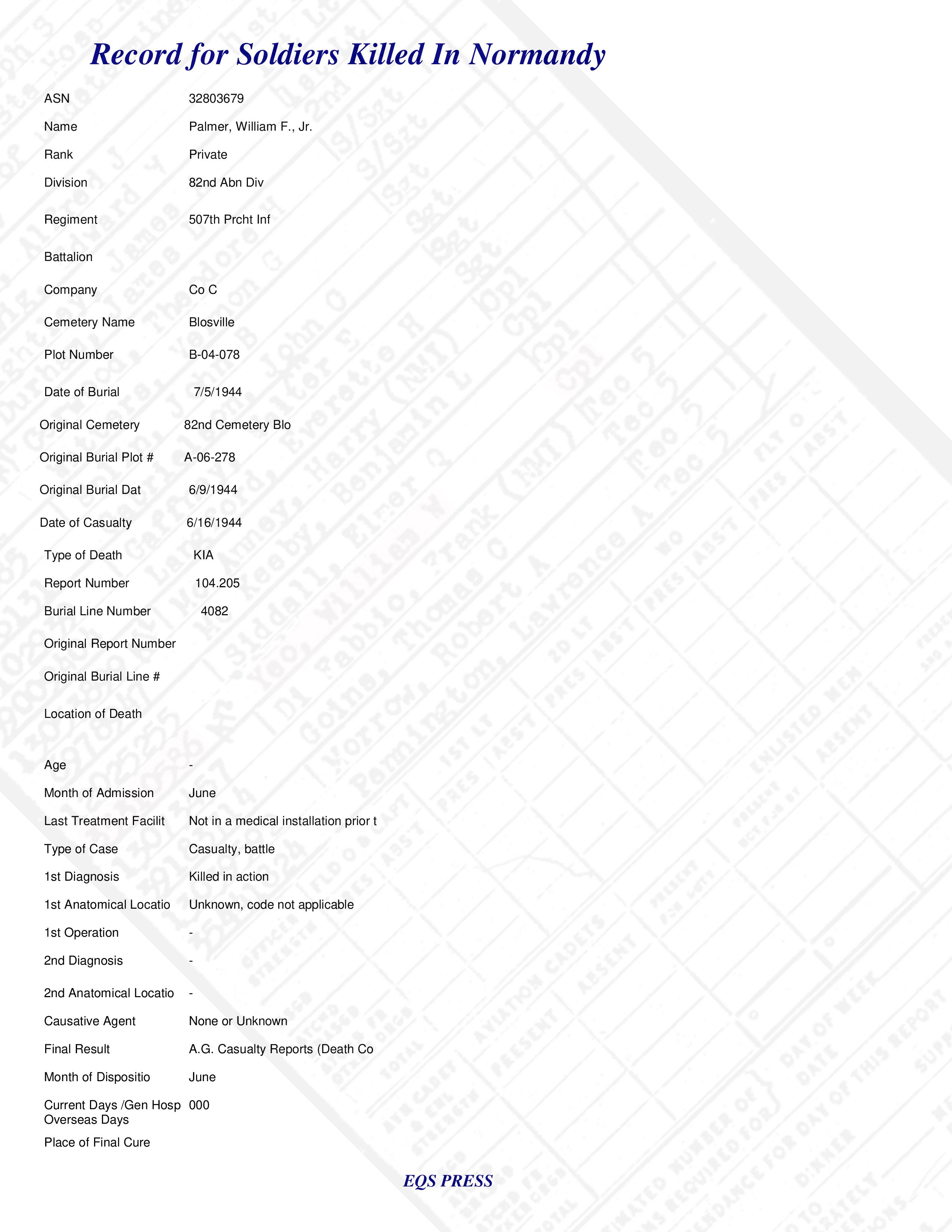 Pvt William F. Palmer Jr. Co C 507th Prcht