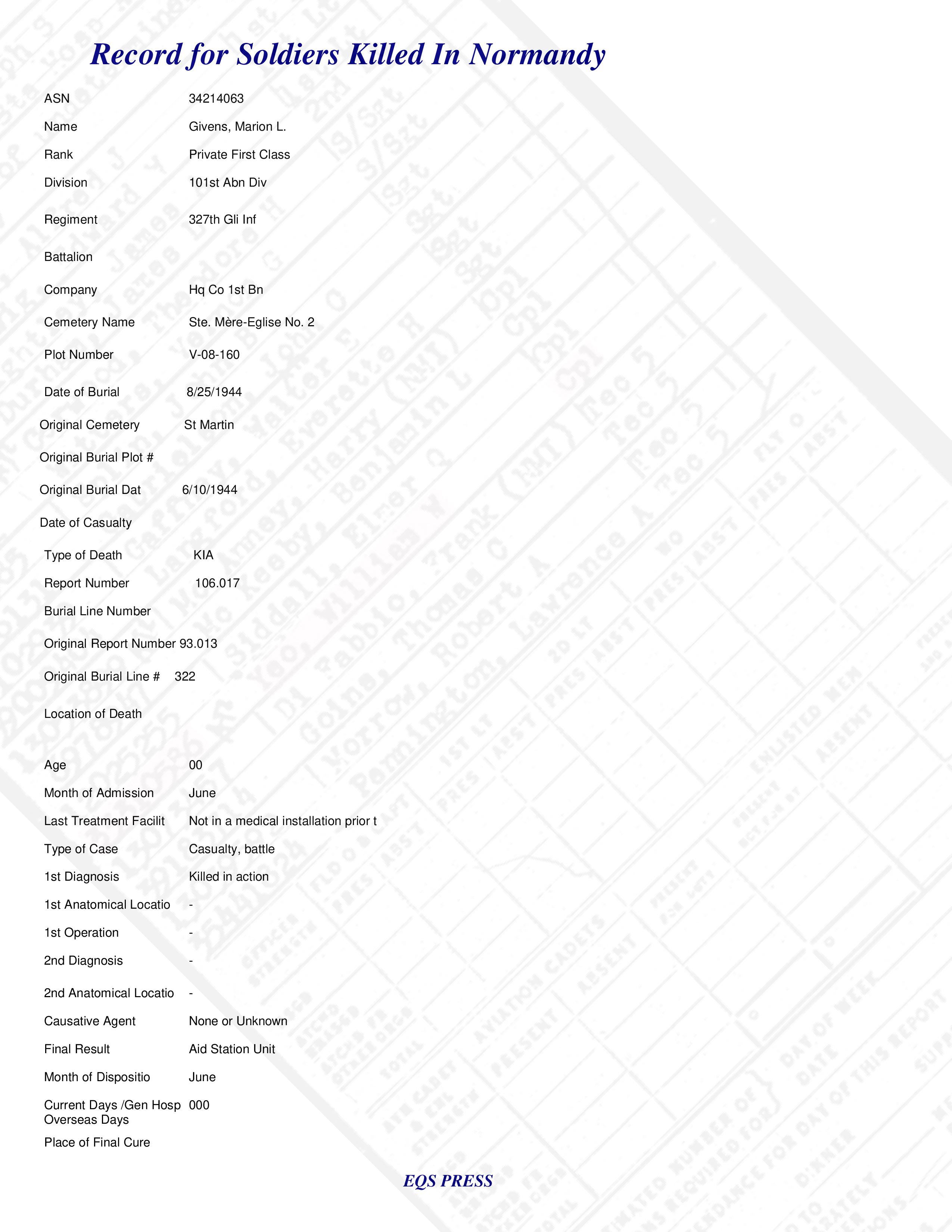 Pfc Marion L. Givens Hq Co 1st Bn 327th Gil