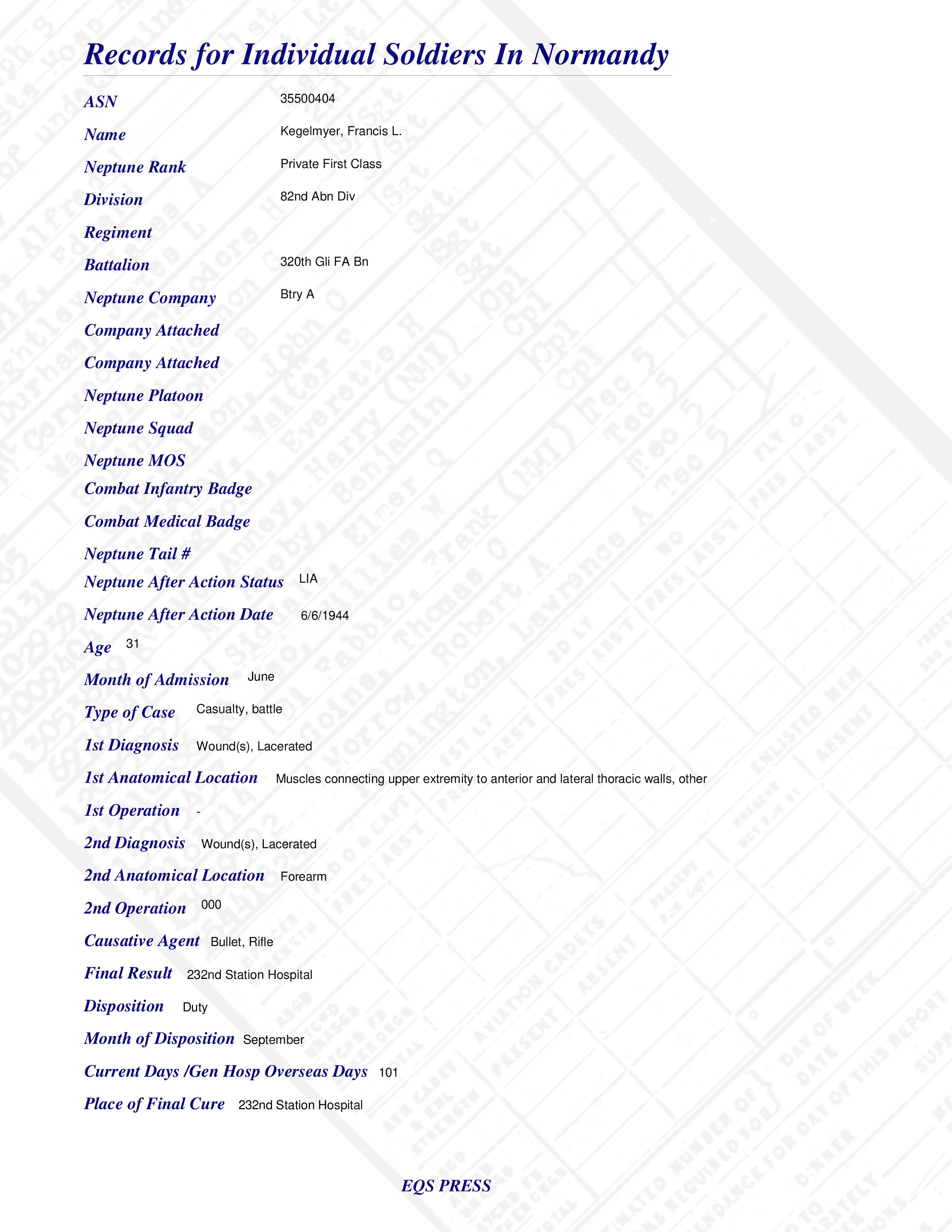 Pfc Francis L. Kegelmyer Btry A 320th Gli