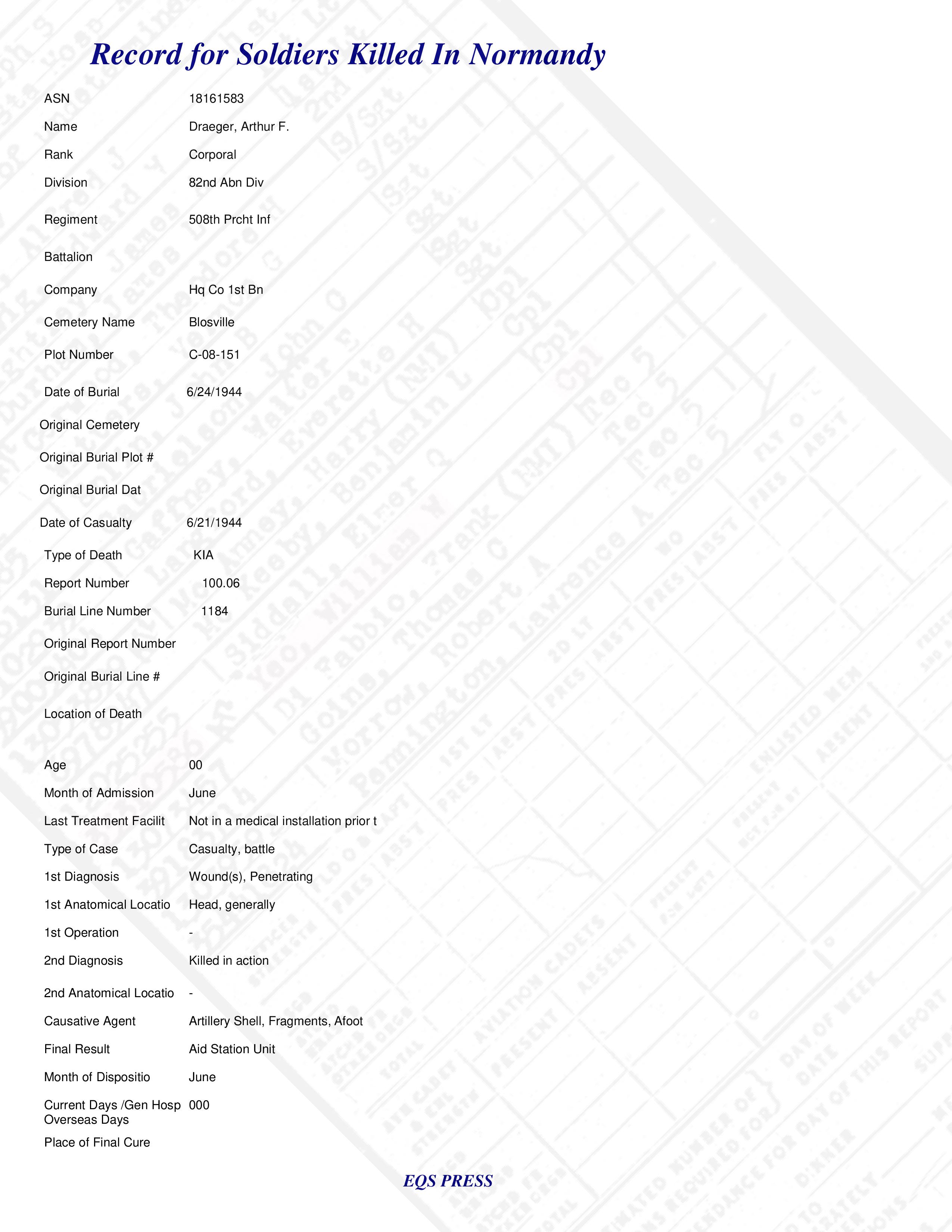 Cpl Arthur F. Draeger Hq Co 1st Bn 508th Prcht Inf atchd to 82nd Abn Div Military Records