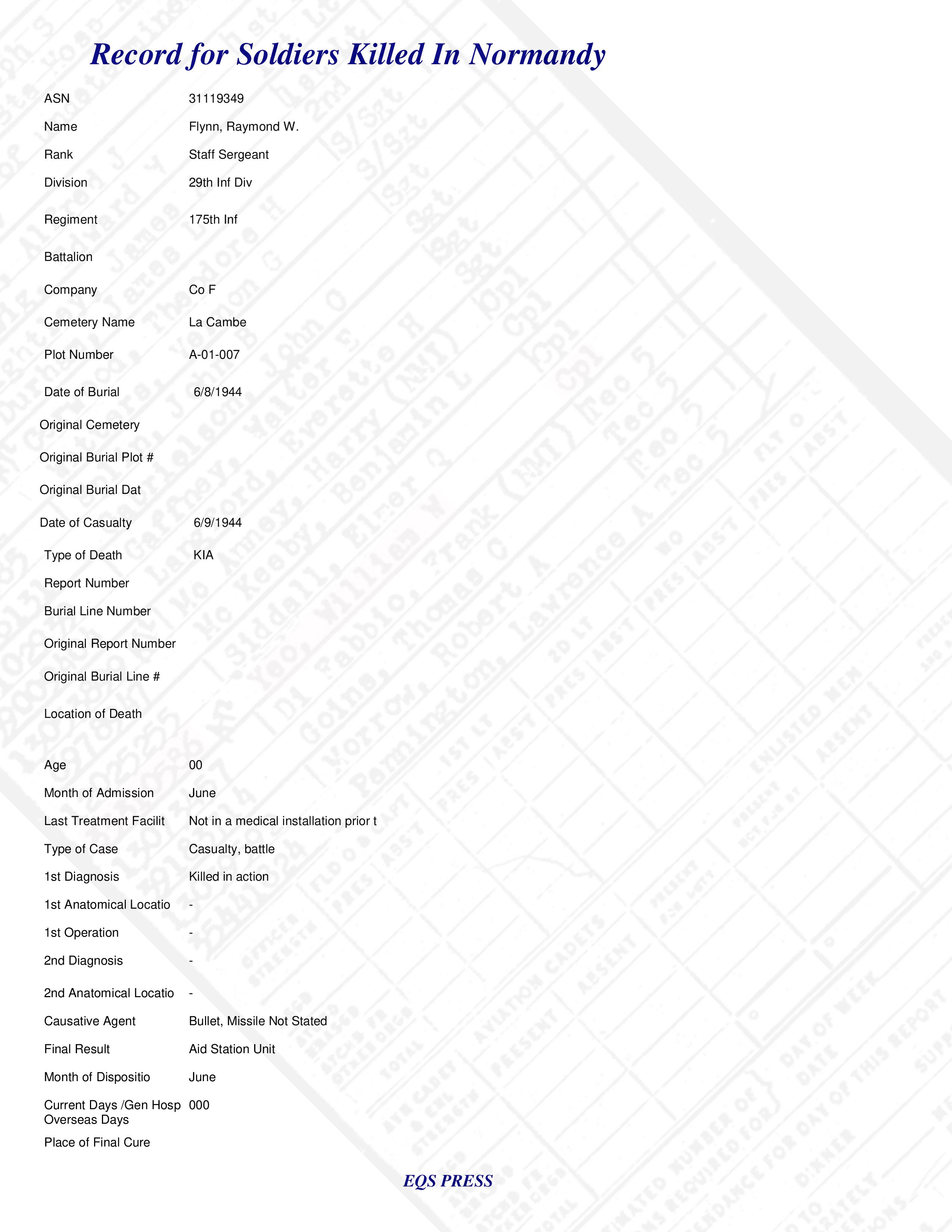 S/Sgt Raymond W. Flynn Co F 175th Inf 29th Inf Div Military Records