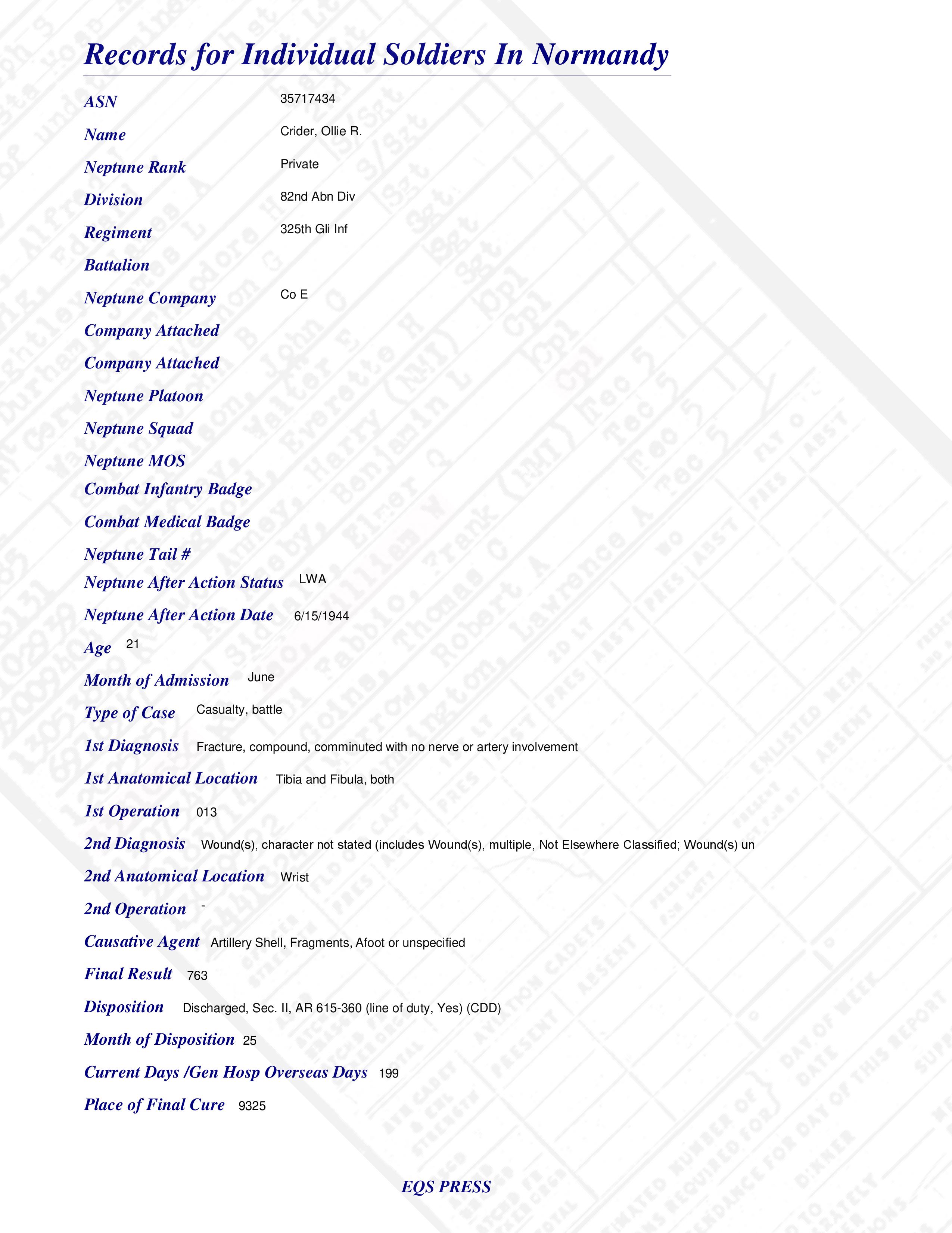 Pvt Ollie R. Crider Co E 325th Gli Inf 82nd Abn Div Military Records