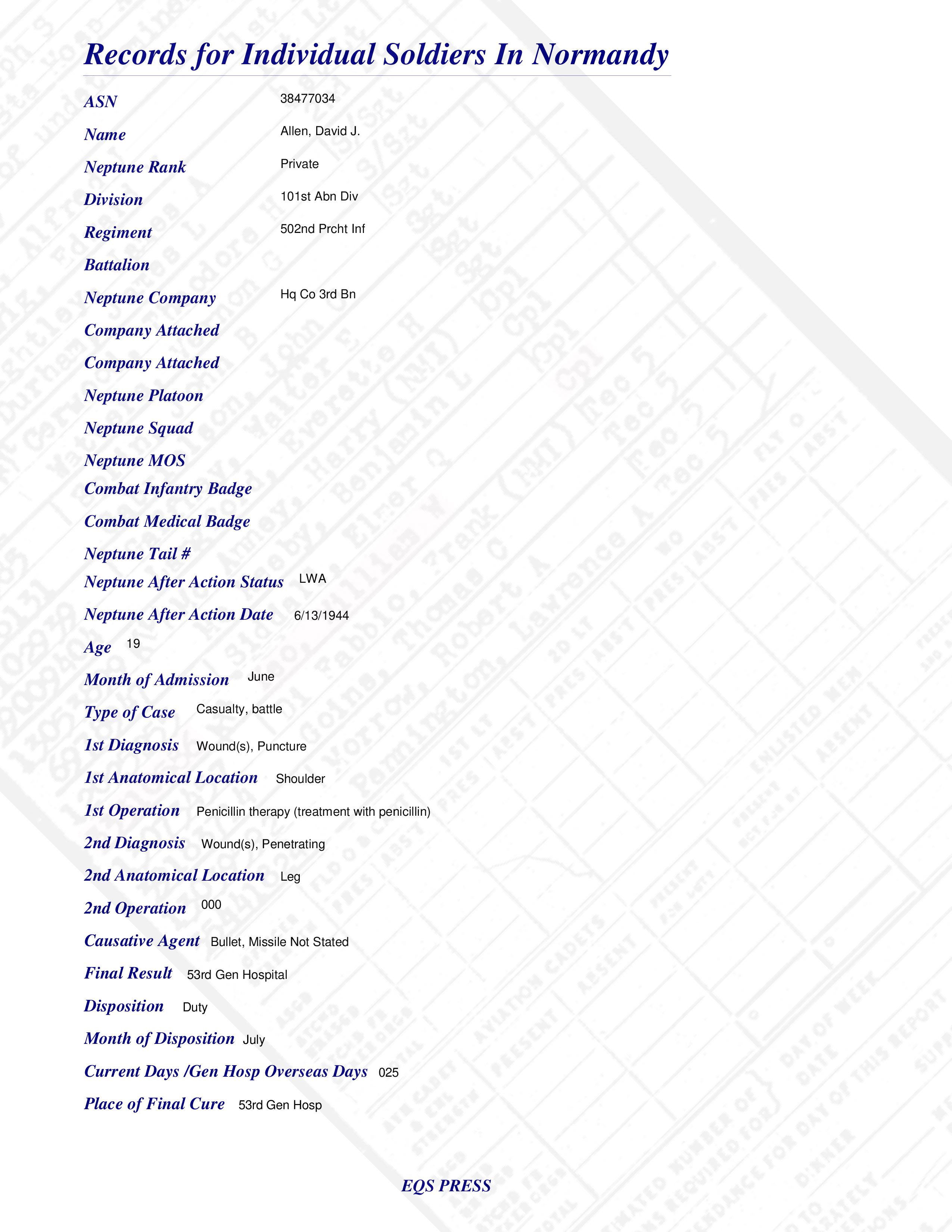 Pvt David J. Allen Hq Co 3rd Bn 502nd Prcht Inf 101st Abn Div Military Records