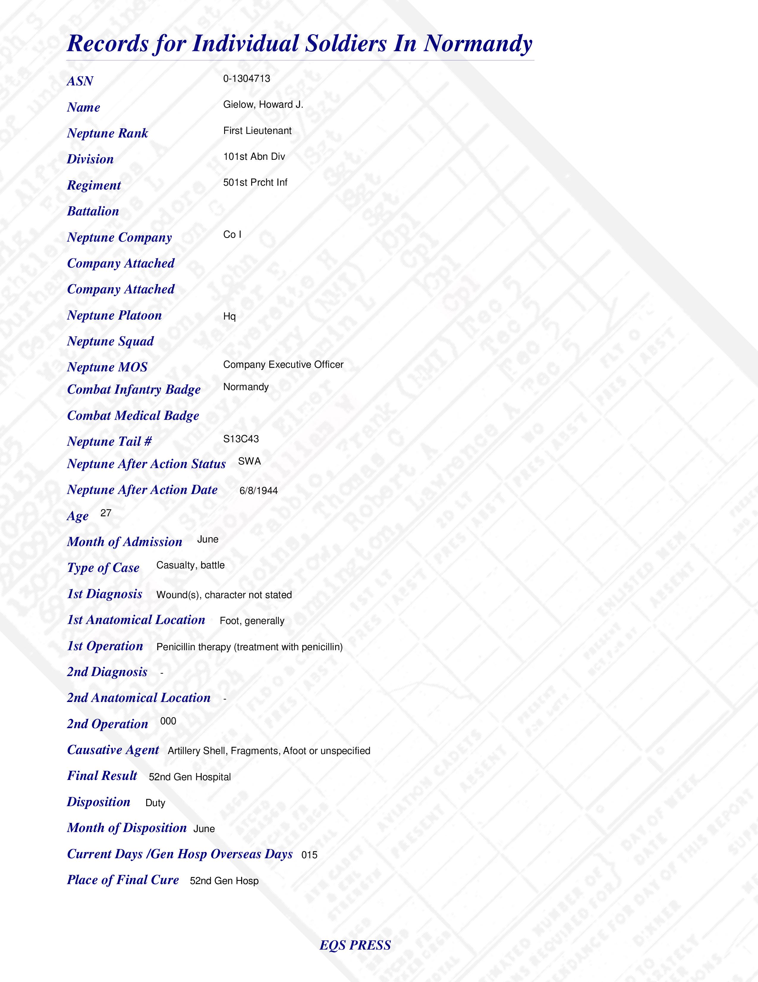1st Lt Howard J. Gielow Co I 501st Prcht Inf