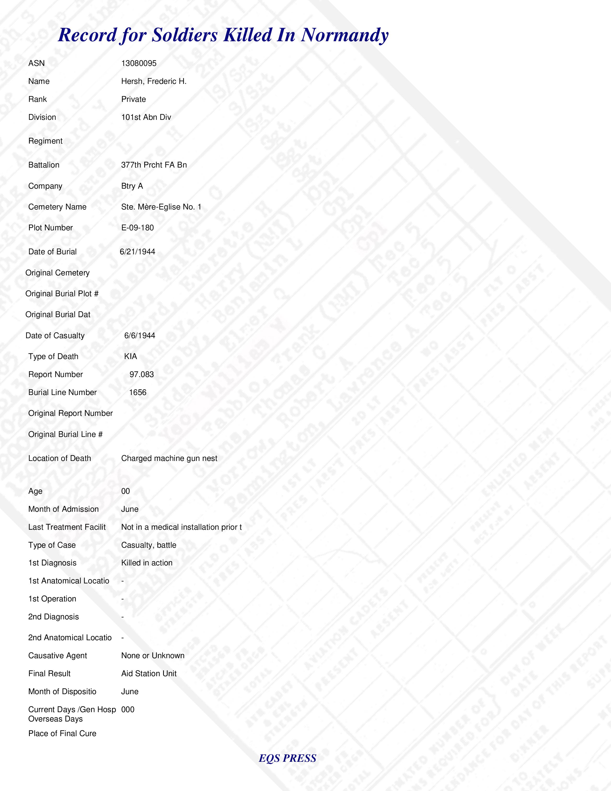 Pvt Frederic H. Hersh Btry A 377th Prcht FA