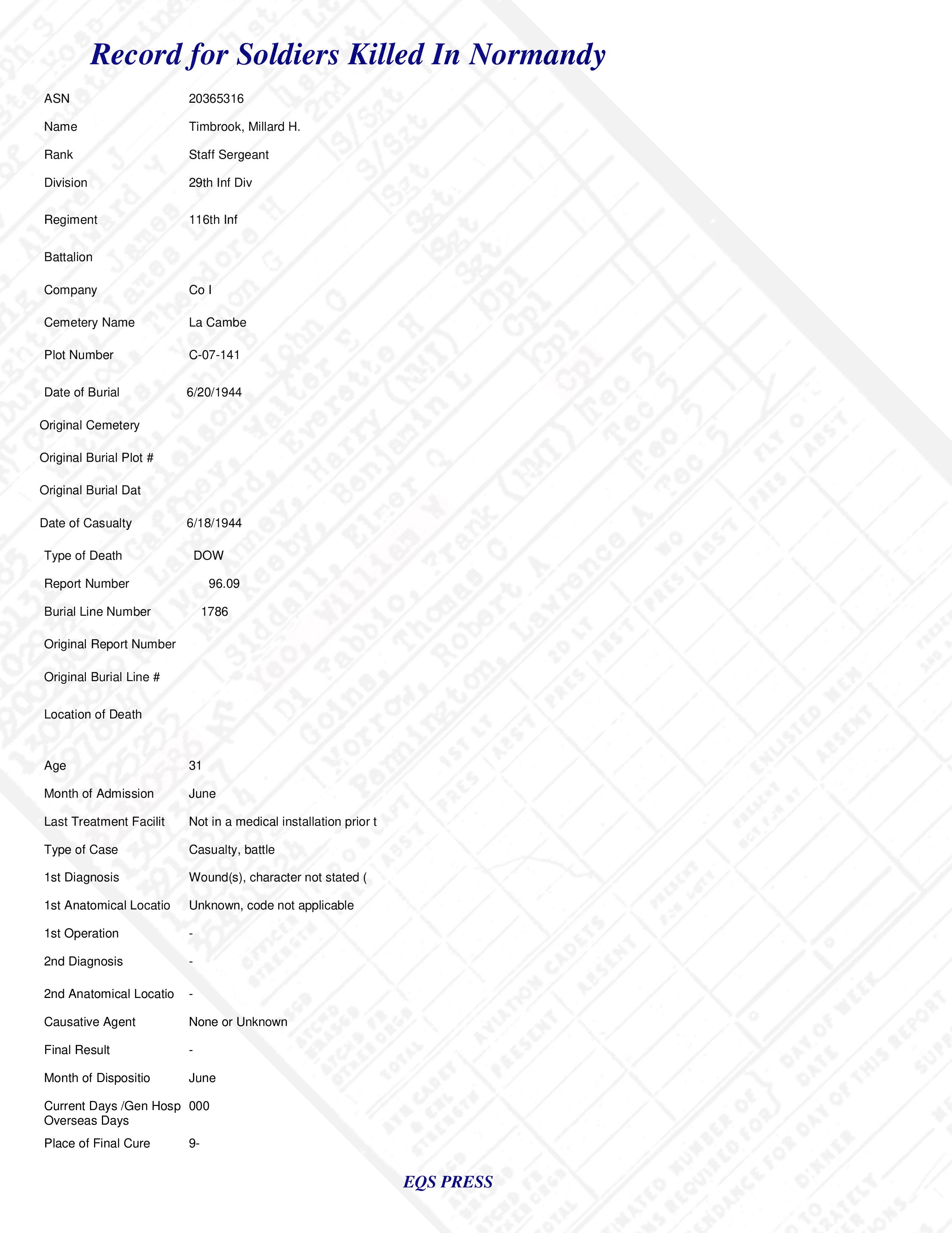 S/Sgt Millard H. Timbrook Co I 116th Inf
