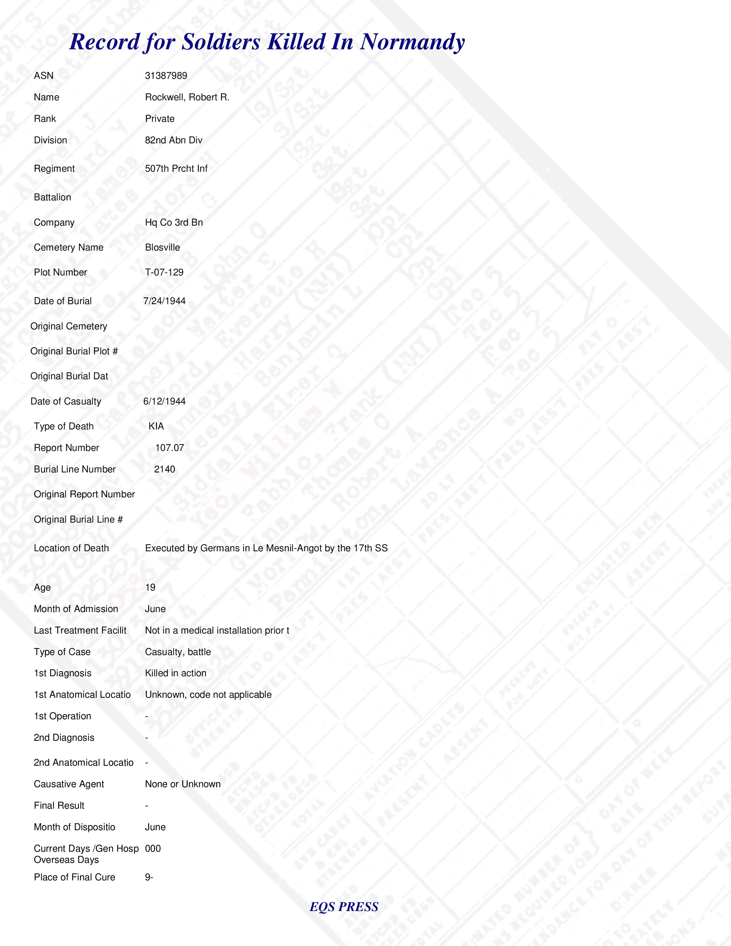 Pvt Robert R. Rockwell Hq Co 3rd Bn 507th