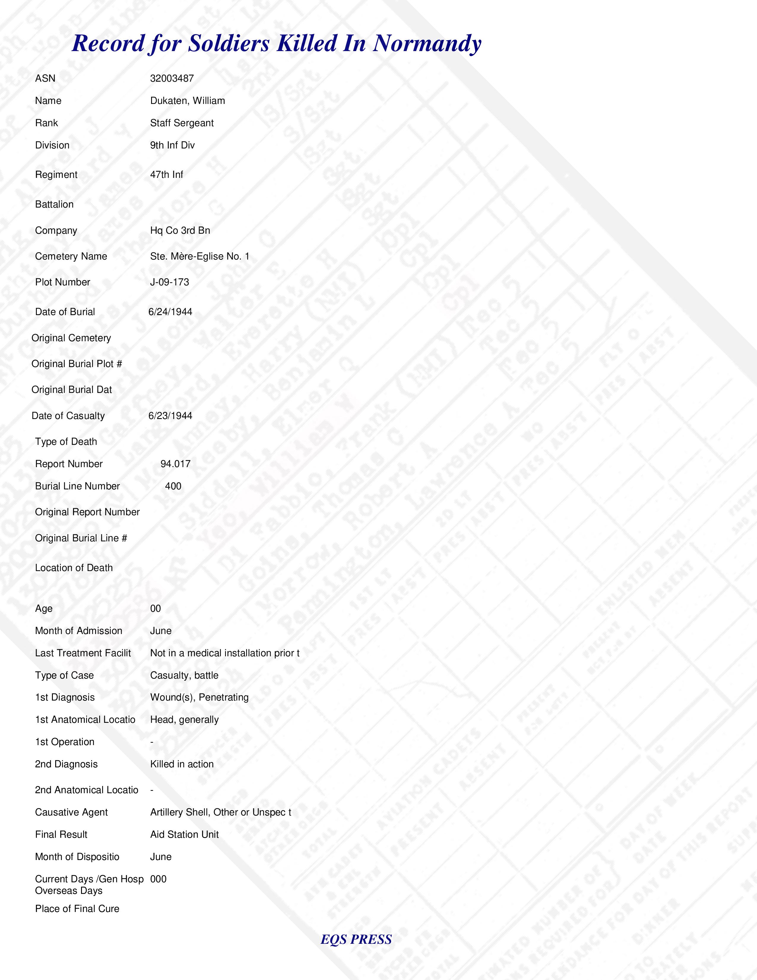 S/Sgt William Dukaten Hq Co 3rd Bn 47th Inf