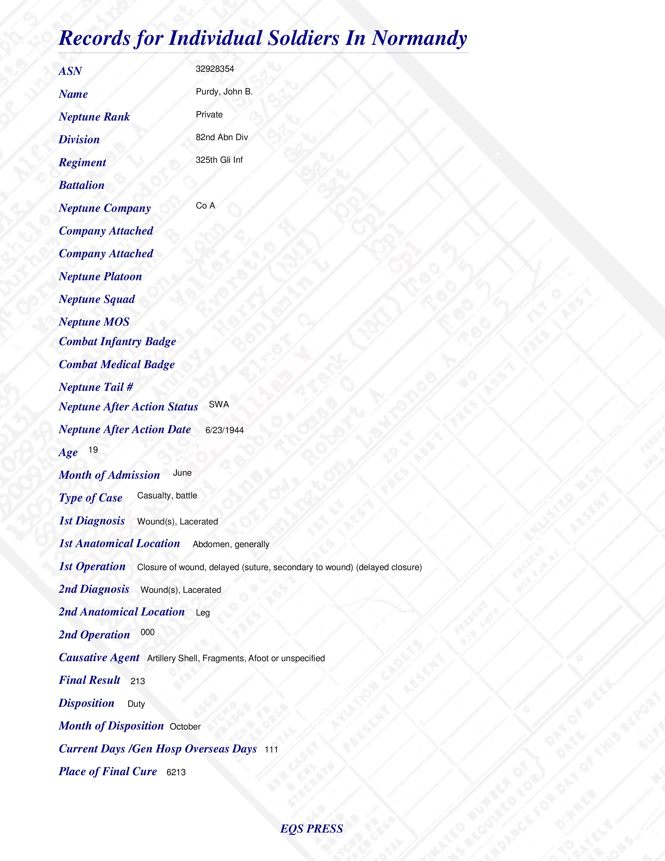 Pvt John B. Purdy Co A 325th Gli Inf 82nd