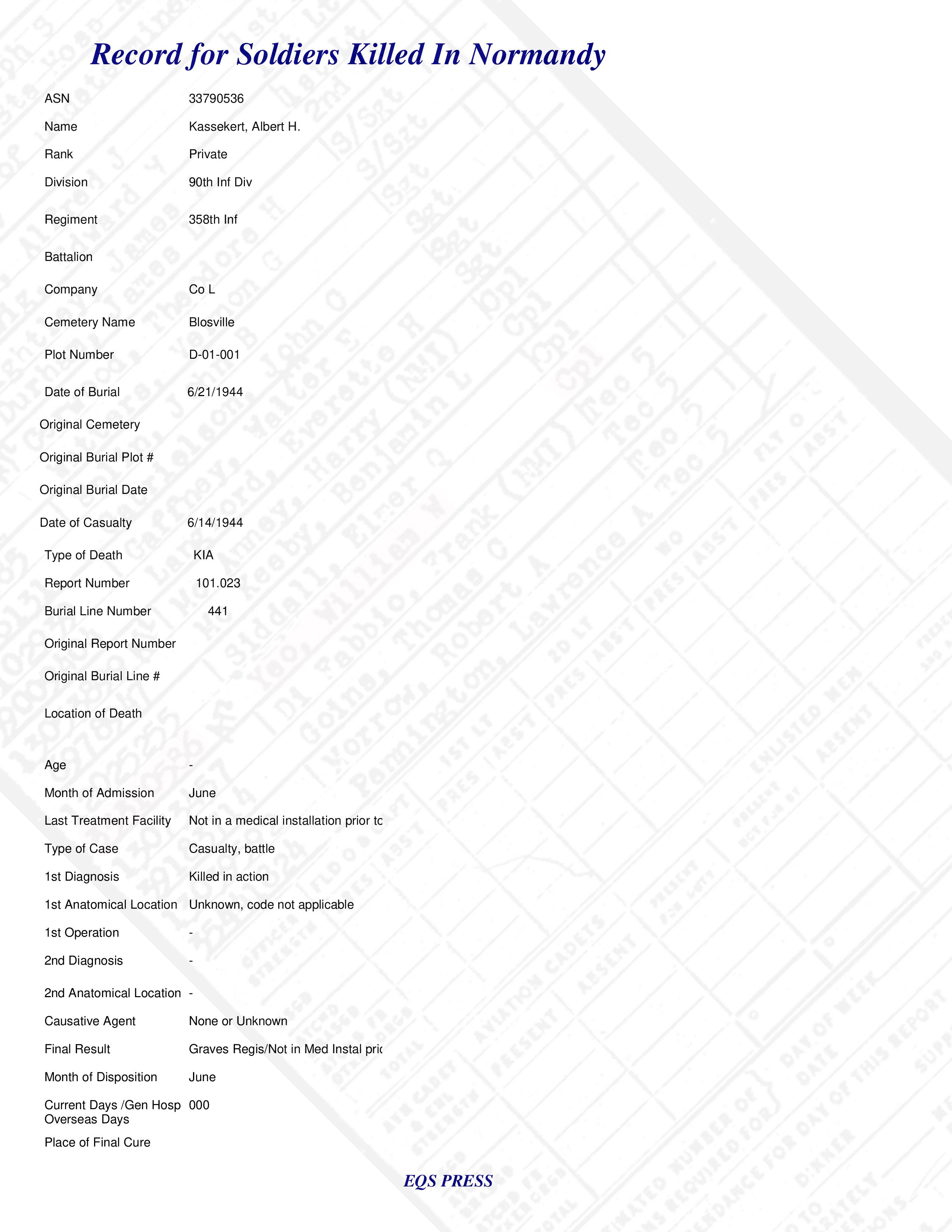Pvt Albert H. Kassekert Co L 358th Inf 90th