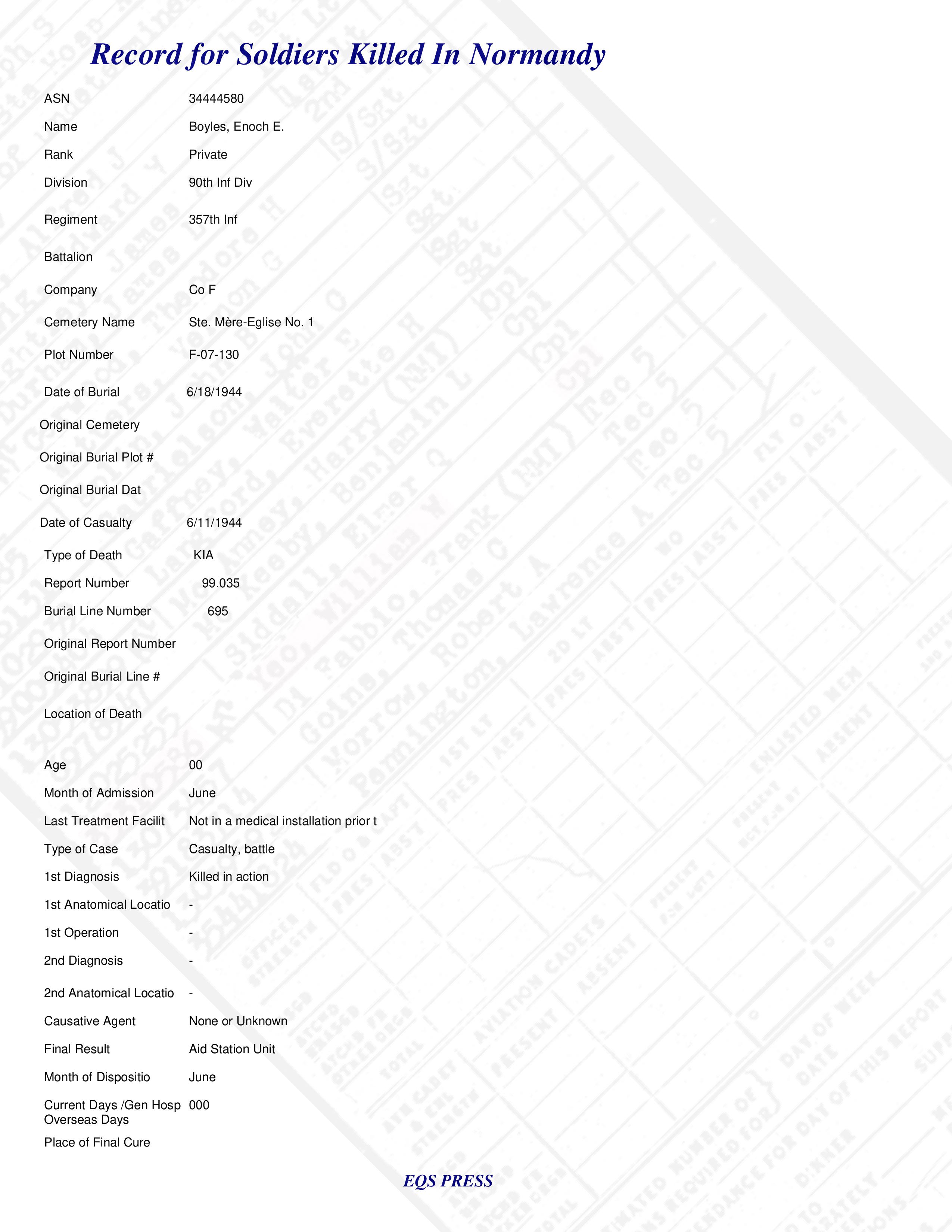 Pvt Enoch E. Boyles Co F 357th Inf 90th Inf