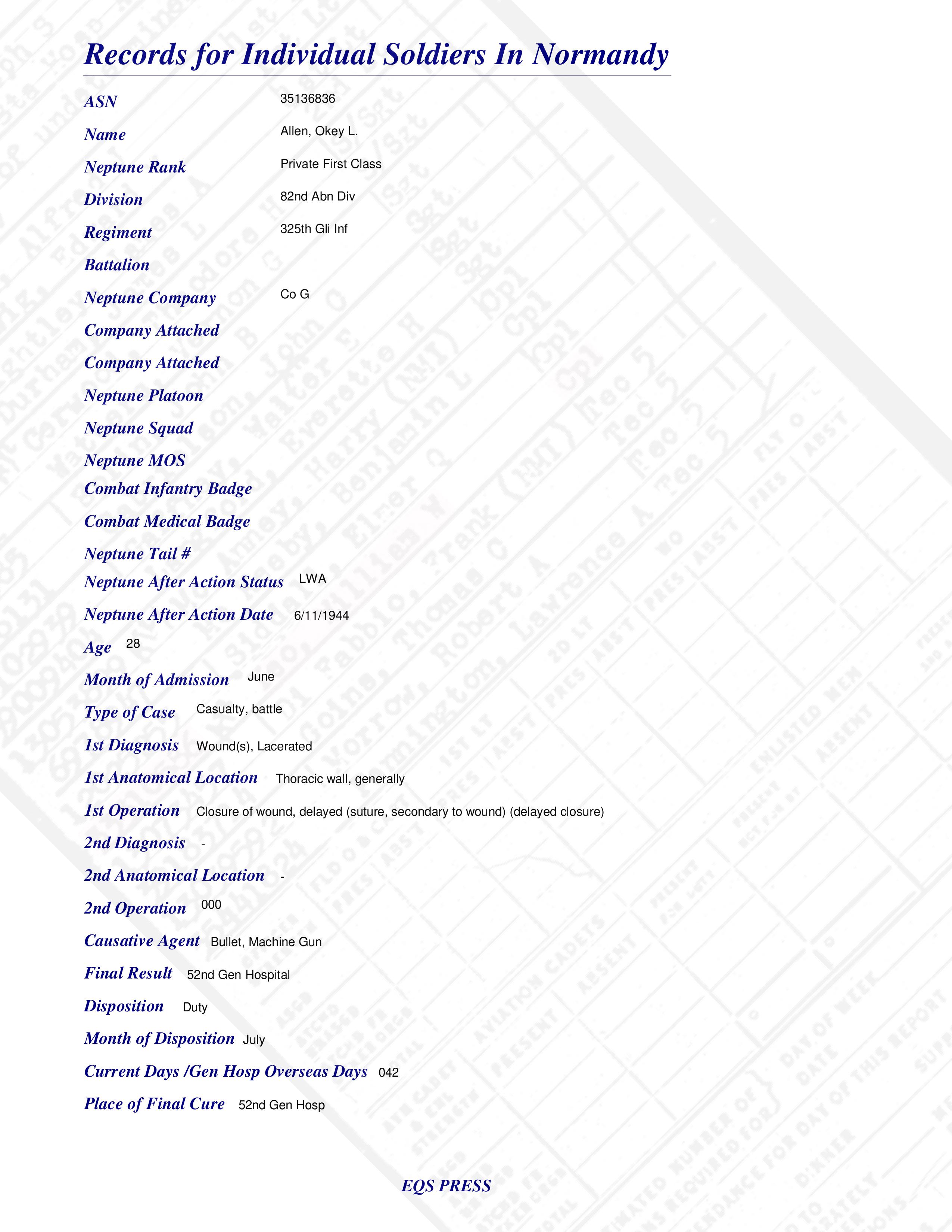 Pfc Okey L. Allen Co G 325th Gli Inf 82nd