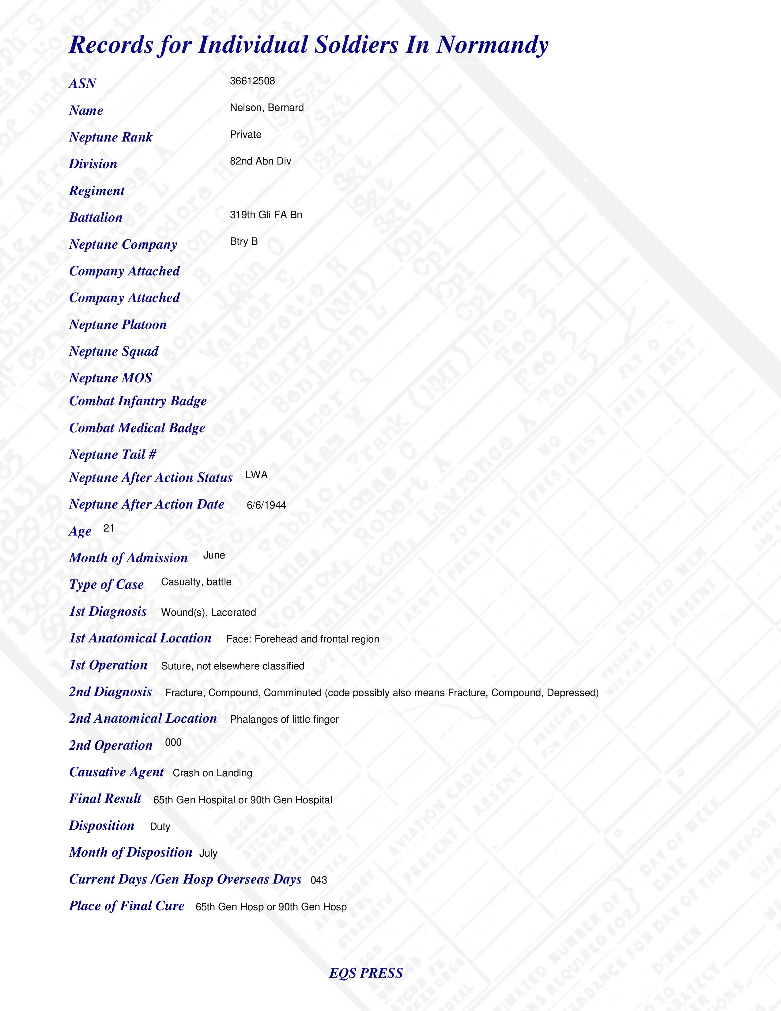 Pvt Bernard Nelson Btry B 319th Gli FA Bn