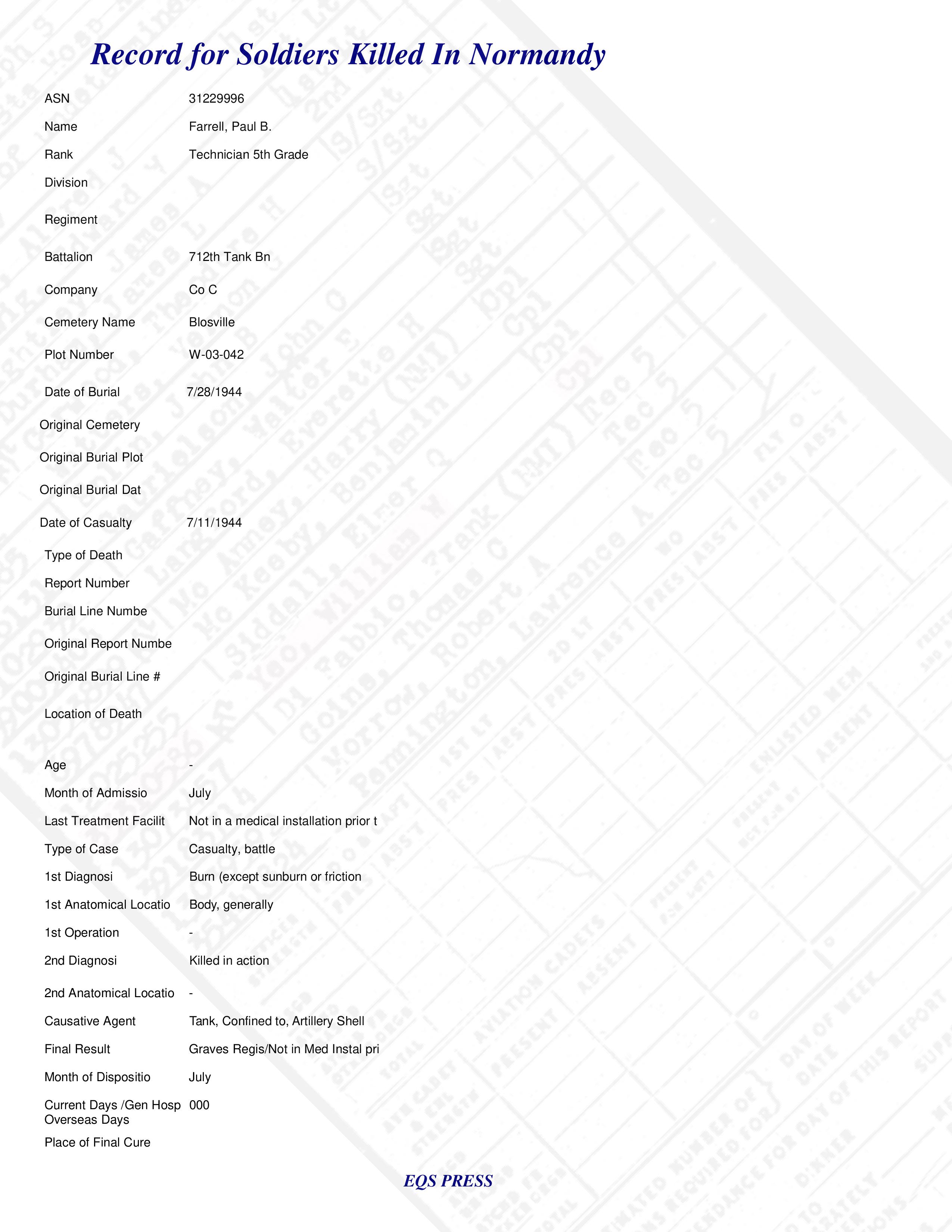 T/5 Paul B. Farrell Co C 712th Tank Bn Military Records IDPF